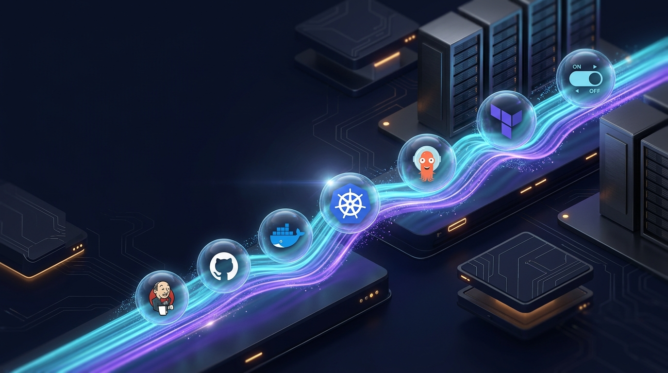 We integrate Jenkins or GitHub Actions, Docker, Registry, Kubernetes, Argo Rollouts, Terraform and Feature Flags into one delivery operating system — auditable, reproducible, transferable to your team.